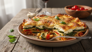 This lasagna provides multiple servings of vegetables while delivering protein from three types of cheese. Using whole wheat lasagna noodles adds fiber, and part-skim ricotta and mozzarella can reduce saturated fat without sacrificing creaminess.