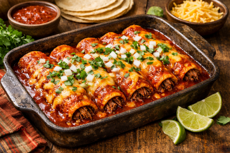 These Birria Enchiladas take the viral birria trend and transform it into a rich, satisfying enchilada experience that combines the best of both worlds. Beef chuck roast gets slow-braised with aromatic cumin and oregano until it’s fall-apart tender and deeply flavorful, then gets wrapped in lightly toasted corn tortillas for authentic texture. Everything gets smothered in red enchilada sauce and topped with melted cheese that bakes into golden, bubbly perfection, while fresh cilantro and onions add that signature birria brightness—creating a dish that’s both comforting and exciting.