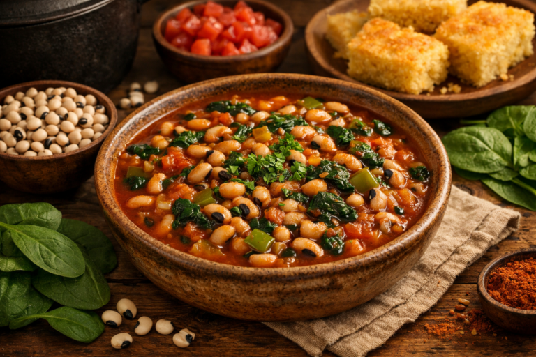 This Black Eyed Peas Stew brings Southern tradition and wholesome nutrition together in a warming bowl that’s perfect for New Year’s Day or any time you want comforting, plant-based goodness. Tender black-eyed peas simmer with aromatic vegetables and tomatoes in a flavorful broth enriched with warm spices like paprika and cumin, while fresh spinach wilts in at the end for a pop of color and nutrients. According to tradition, eating black-eyed peas on New Year’s Day brings good luck and prosperity—and with flavors this good, you’ll want to make this stew all year long.