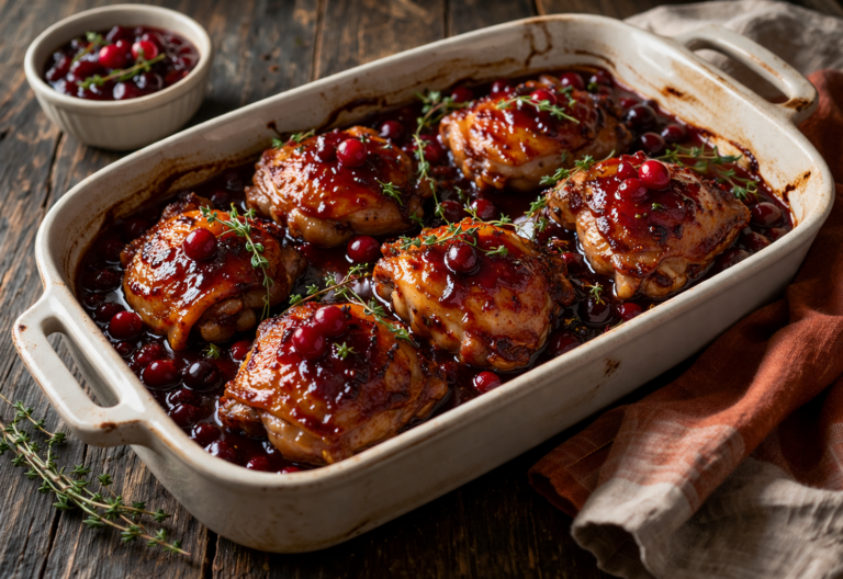 Tender baked chicken thighs glazed in a sweet-tangy sauce of Catalina dressing, cranberry sauce, and savory onion soup mix—pantry cooking at its most surprisingly delicious.
