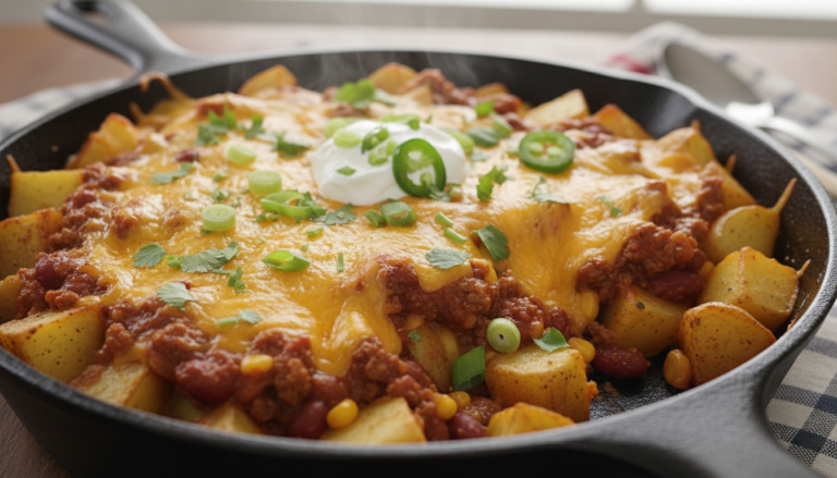 This Chili Cheese Potato Bake draws directly on that tradition, combining the layered casserole format with two of the most beloved flavors in American comfort food—chili and loaded potatoes—to produce something that feels simultaneously nostalgic and genuinely exciting.