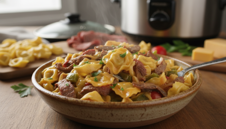 There are certain flavor combinations that feel iconic—beef and provolone, peppers and onions, garlic and Italian seasoning—and this Crockpot Cheesesteak Tortellini brings all those beloved elements together in a dish that’s somehow both familiar and completely new. It captures the essence of a Philadelphia cheesesteak, that perfect marriage of savory beef, sweet peppers, melted cheese, and aromatic onions, but transforms it into a hearty pasta dish that practically cooks itself. The addition of cheese-filled tortellini takes it from sandwich-inspired to full comfort meal territory.