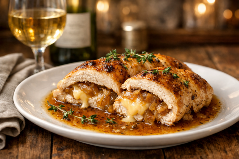 Juicy chicken breasts filled with sweet caramelized onions and gooey Swiss cheese—French-inspired comfort with wine-worthy sophistication.