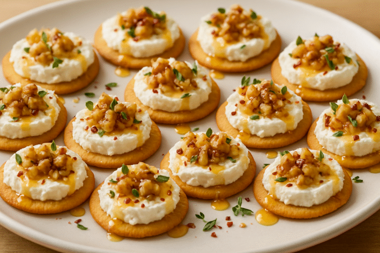 Goat Cheese & Honey Bites feature creamy goat cheese on crispy crackers, topped with crunchy walnuts, a hint of heat, and a drizzle of golden honey.