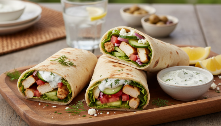 This recipe yields four large wraps when using standard burrito-size (10-inch) whole wheat tortillas. Each wrap provides approximately 30-35 grams of protein from the chicken, substantial fiber from the whole wheat tortilla and vegetables, and healthy fats from olive oil and feta—creating a balanced meal that typically provides 400-500 calories depending on exact portions and tzatziki quantity.