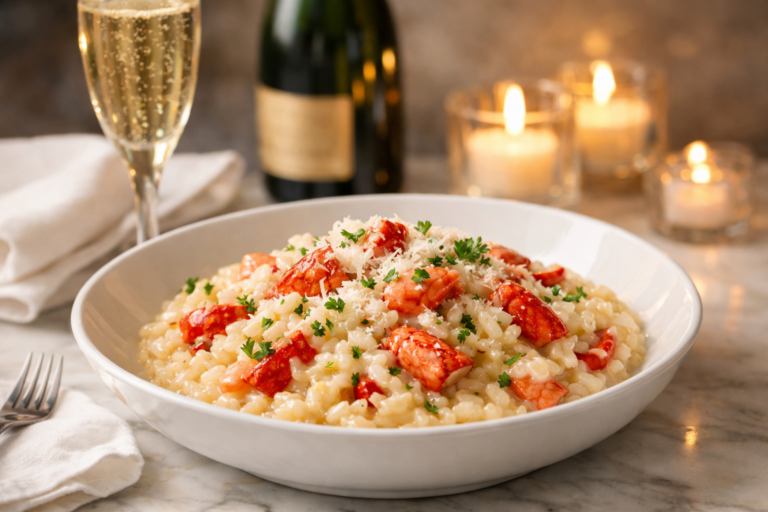 This recipe marries Italian risotto tradition with French luxury ingredients, creating a fusion that represents modern fine dining at its most indulgent. Risotto itself originates from Northern Italy, particularly the Lombardy and Veneto regions where Arborio rice grows abundantly. The technique of slowly adding liquid to rice while stirring constantly dates back centuries. The addition of champagne reflects French haute cuisine’s love affair with cooking in wine and spirits, while lobster has long been prized in coastal French cooking. Together, these elements create a dish that honors both culinary traditions while feeling utterly contemporary and celebratory.