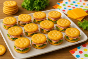 These mini sandwiches provide portion control naturally through their small size. Using whole grain crackers as an alternative can add fiber while maintaining the same convenient, handheld format.