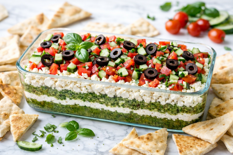 There’s something incredibly appealing about layered dips—each stratum visible through the clear serving dish, colors stacking beautifully, flavors distinct yet harmonious. This Pesto and Feta Layer Dip captures that visual appeal while delivering fresh, vibrant Mediterranean flavors that feel light and wholesome rather than heavy and indulgent. It’s the kind of dish that makes you feel good about what you’re eating while still being completely satisfying.