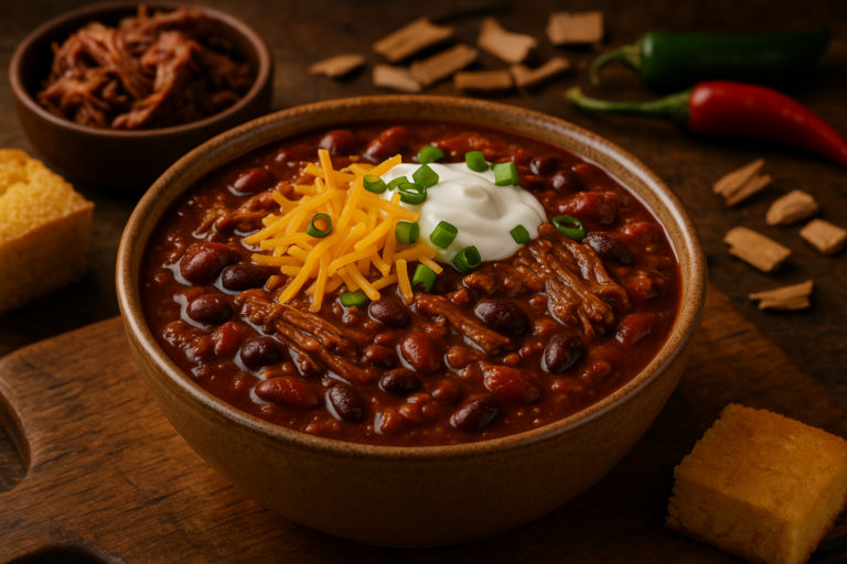 This Smoked Pulled Pork Chili is a game-changer that combines the best of BBQ and comfort food in one incredible bowl. Tender smoked pulled pork brings rich, meaty flavor and that signature smoky depth that makes every spoonful irresistible, while kidney and black beans add hearty texture and substance. The blend of warm spices—chili powder, cumin, and smoked paprika—creates layers of complex flavor that develop beautifully during the long simmer, resulting in a chili that’s both familiar and excitingly different from traditional versions.