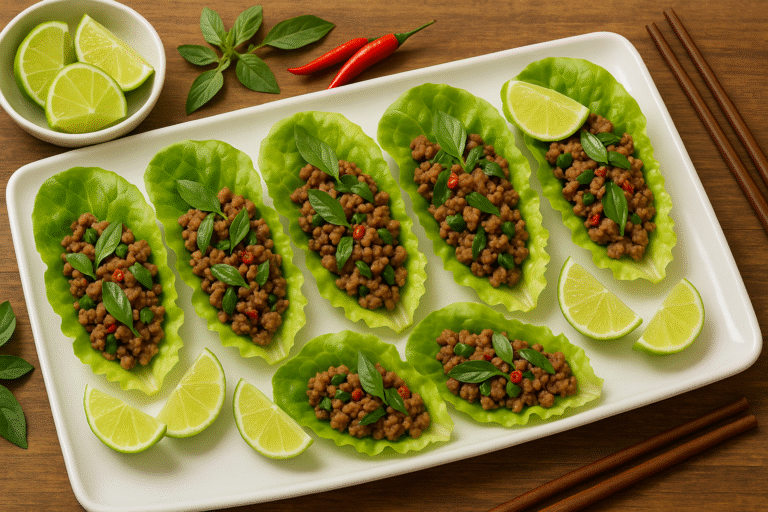 These Thai Basil Beef Rolls bring the bold, aromatic flavors of Thai cuisine to a fresh, light format that’s perfect for a healthy weeknight dinner or entertaining. Savory ground beef is infused with the classic Thai trio of soy sauce, fish sauce, and oyster sauce, then elevated with fragrant Thai basil and a hint of heat from red chili flakes. The aromatic beef mixture gets nestled into crisp lettuce leaves that serve as the perfect edible vessel, while fresh lime wedges add a bright, citrusy finish that ties all the flavors together.